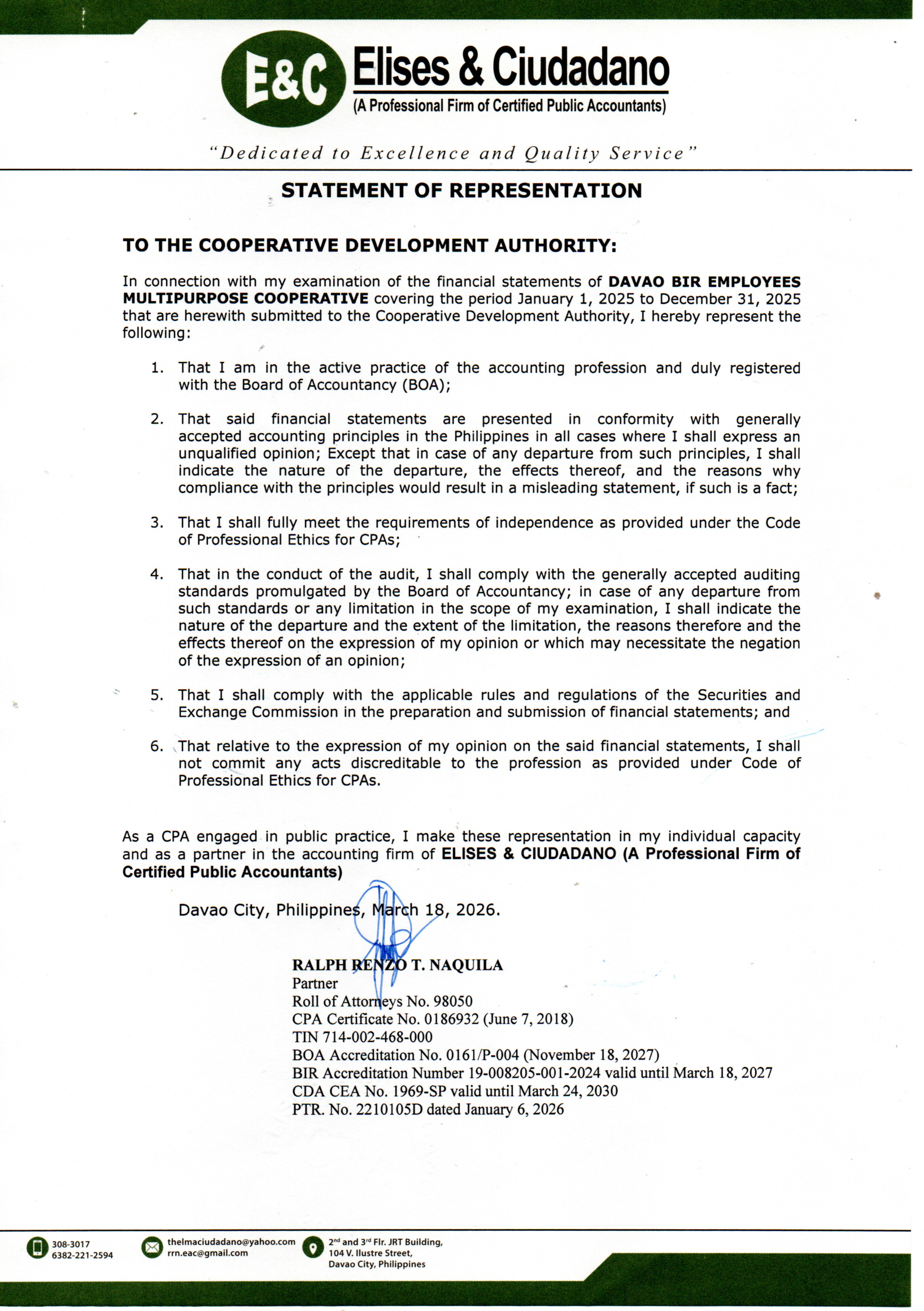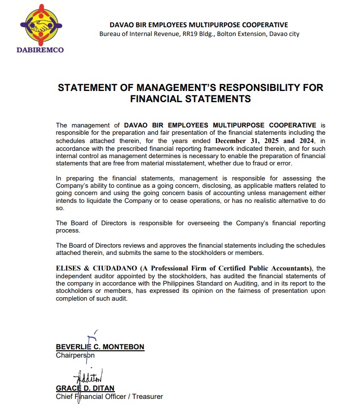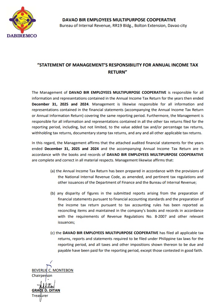 Statement of Management's Responsibility for Annual Income Tax Return